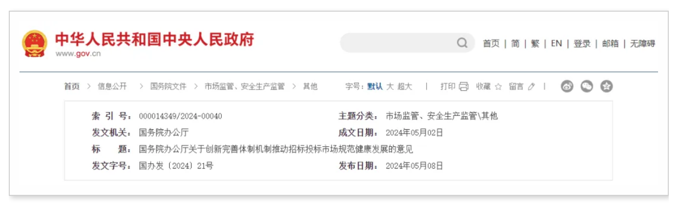 國務院辦公廳關于創(chuàng)新完善體制機制推動招標投標市場規(guī)范健康發(fā)展的意見 國辦發(fā)〔2024〕21號 各省、自治區(qū)、直轄市人民政府,國務院各部委、各直屬機構: 招標投標...