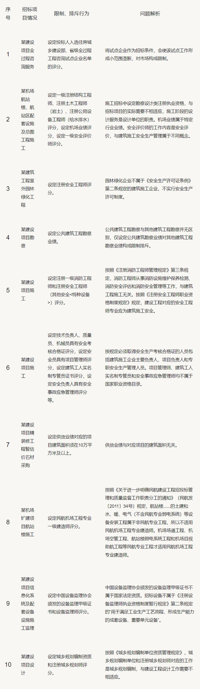 為規(guī)范全省房屋建筑和市政工程招標(biāo)投標(biāo)活動,引導(dǎo)招標(biāo)人、招標(biāo)代理機(jī)構(gòu)規(guī)范編制招標(biāo)文件,四川省住建廳每季度公布一批房屋建筑和市政工程招標(biāo)文件中限制、排斥潛在投標(biāo)人行為典型事例,供招標(biāo)人、招標(biāo)代理機(jī)構(gòu)和監(jiān)督部門對照檢查,以避免出現(xiàn)類似情形。此次為公布的第一批典型事例。