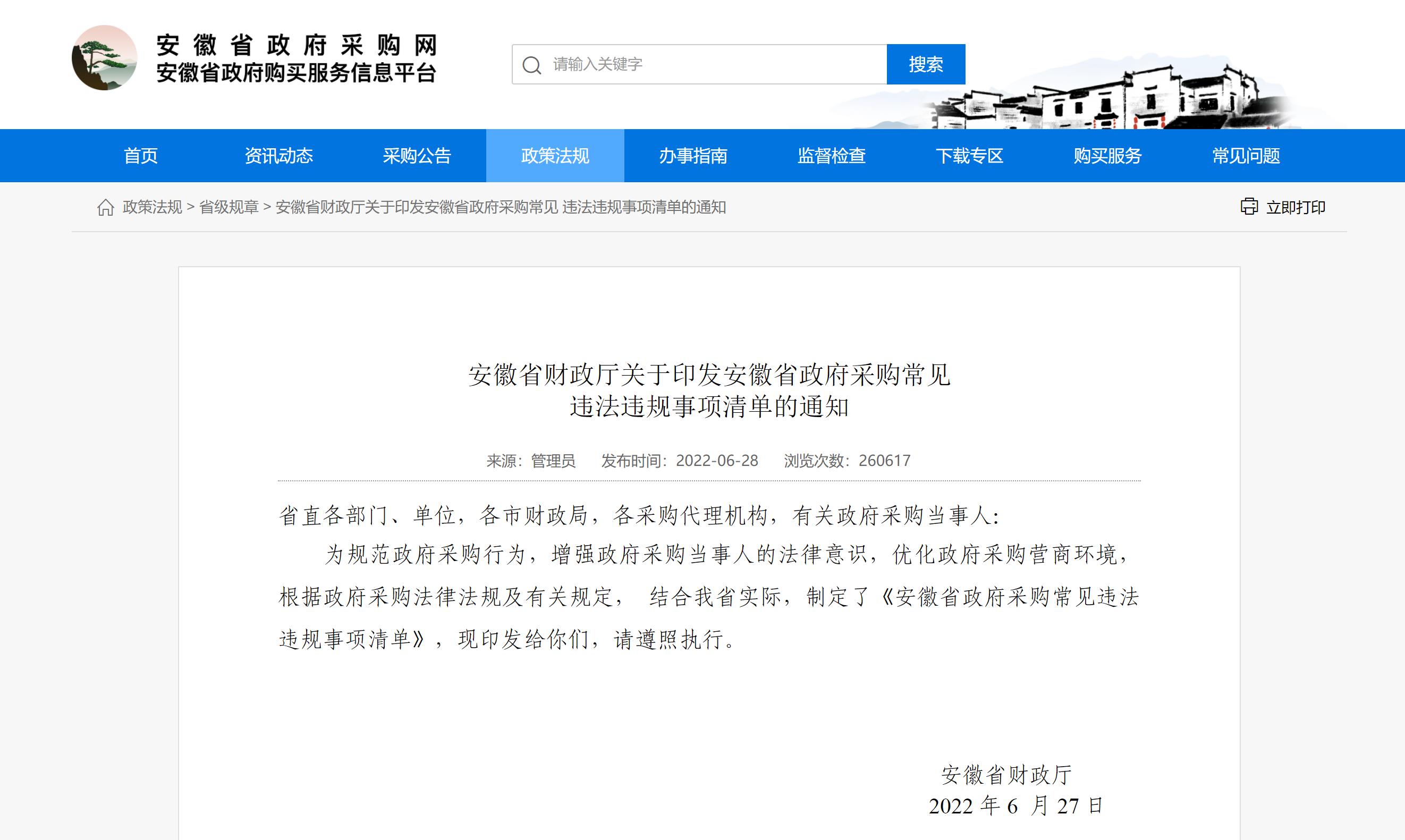 安徽|印發(fā)政府采購常見違法違規(guī)事項...