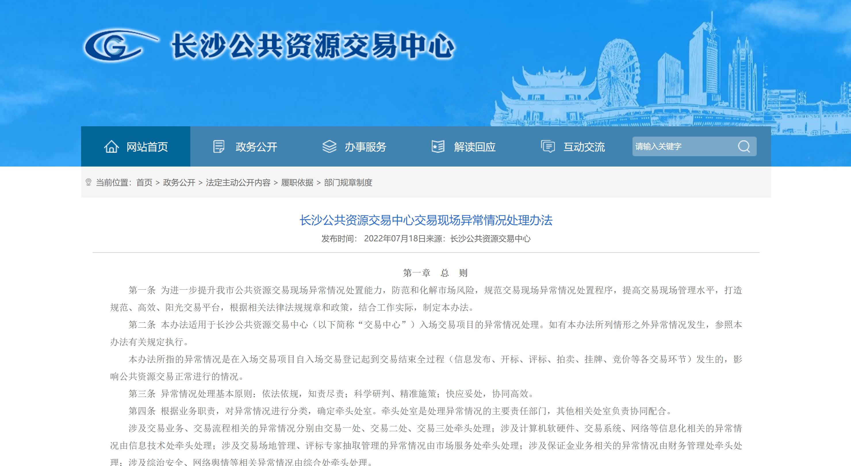近日,長(zhǎng)沙公共資源交易中心出臺(tái)了《交易現(xiàn)場(chǎng)異常情況處理辦法》(以下簡(jiǎn)稱(chēng)《辦法》),對(duì)入場(chǎng)交易項(xiàng)目全過(guò)程中發(fā)生的異常情況處理作出規(guī)定。