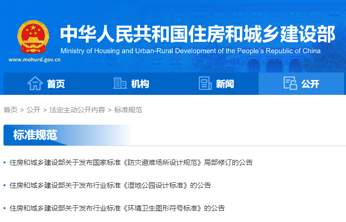 近日,住房和城鄉(xiāng)建設部發(fā)布《濕地公園設計標準》《環(huán)境衛(wèi)生圖形符號標準》以及對《防災避難場所設計規(guī)范》局部修訂的公告。
